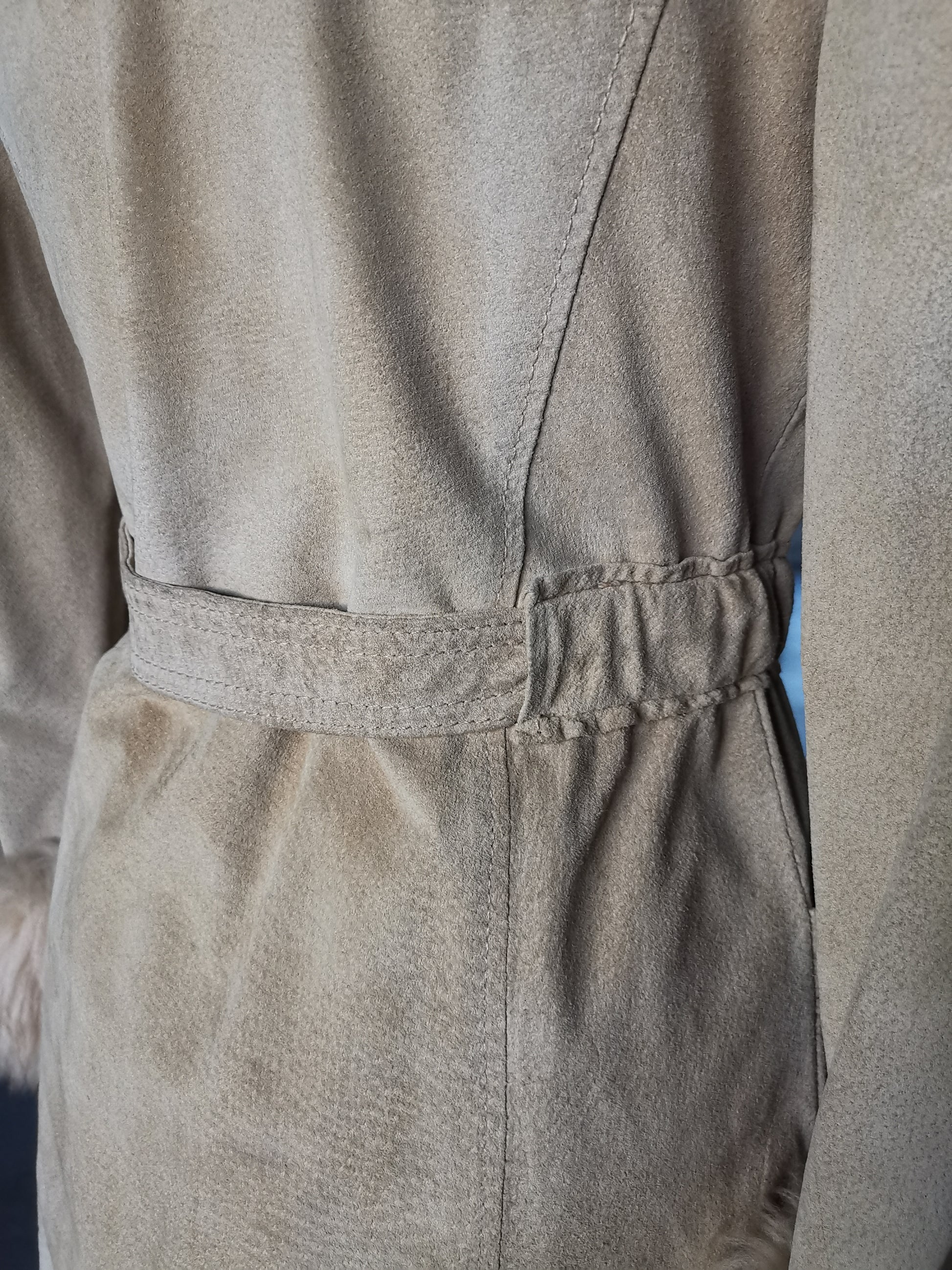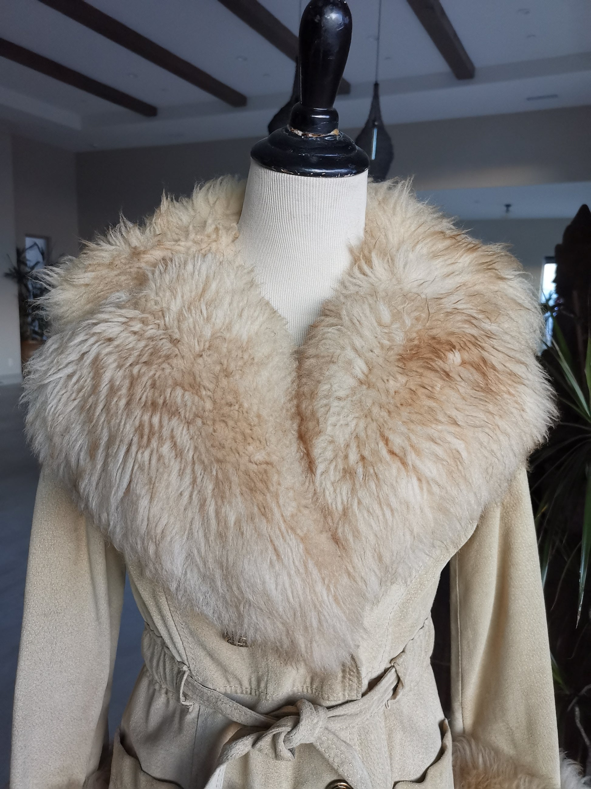 70's Glam massive lamb fur collar tan suede belted/wrap trimmed double breasted Coat sz Small/Med
